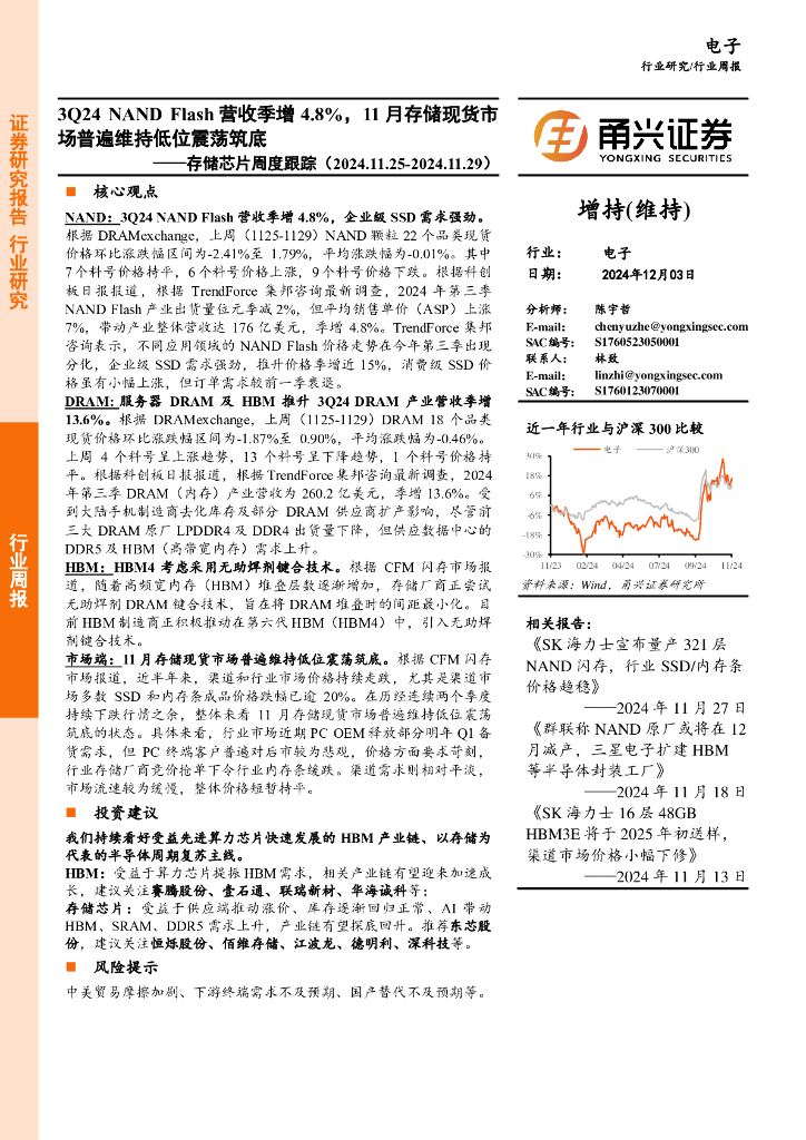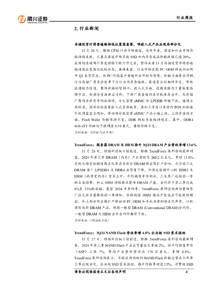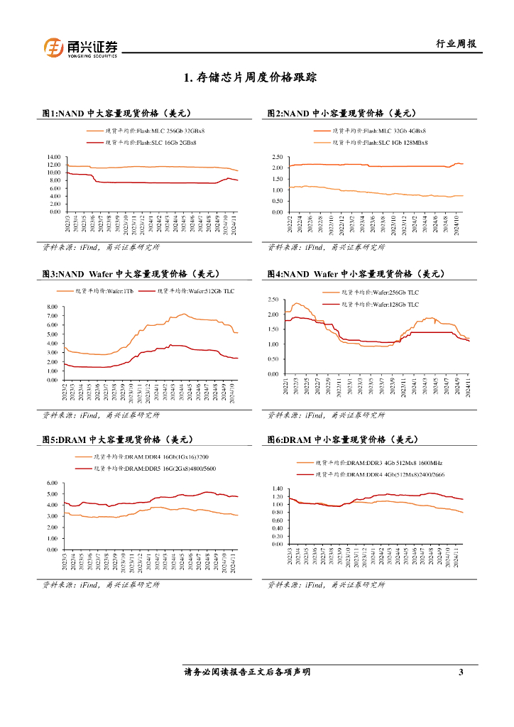 甬兴证券:电子行业存储芯片周度跟踪:3Q24NANDFlash营收季增4.8%,11月存储现货市场普遍维持低位震荡筑底.pdf