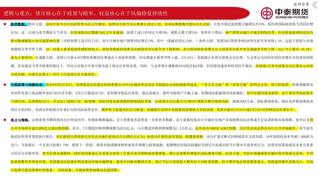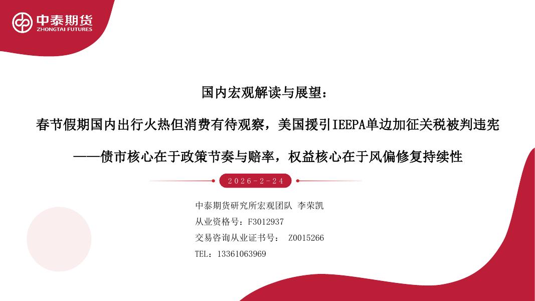 中泰期货:国内宏观解读与展望:春节假期国内出行火热但消费有待观察,美国援引IEEPA单边加征关税被判违宪——债市核心在于政策节奏与赔率,权益核心在于风偏修复持续性-260224.pdf