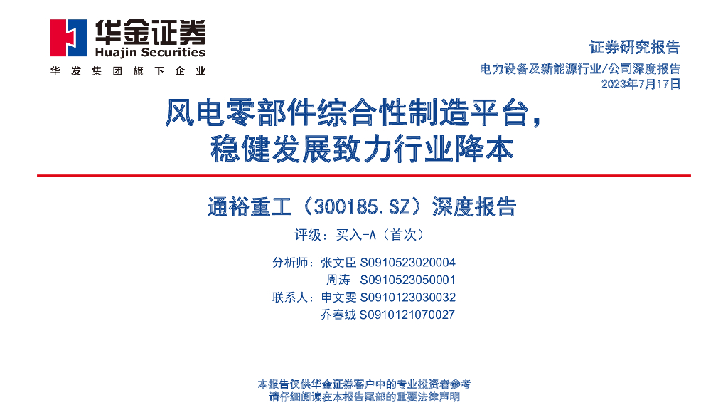 华金证券:通裕重工(300185)-深度报告:风电零部件综合性制造平台,稳健发展致力行业降本.pdf