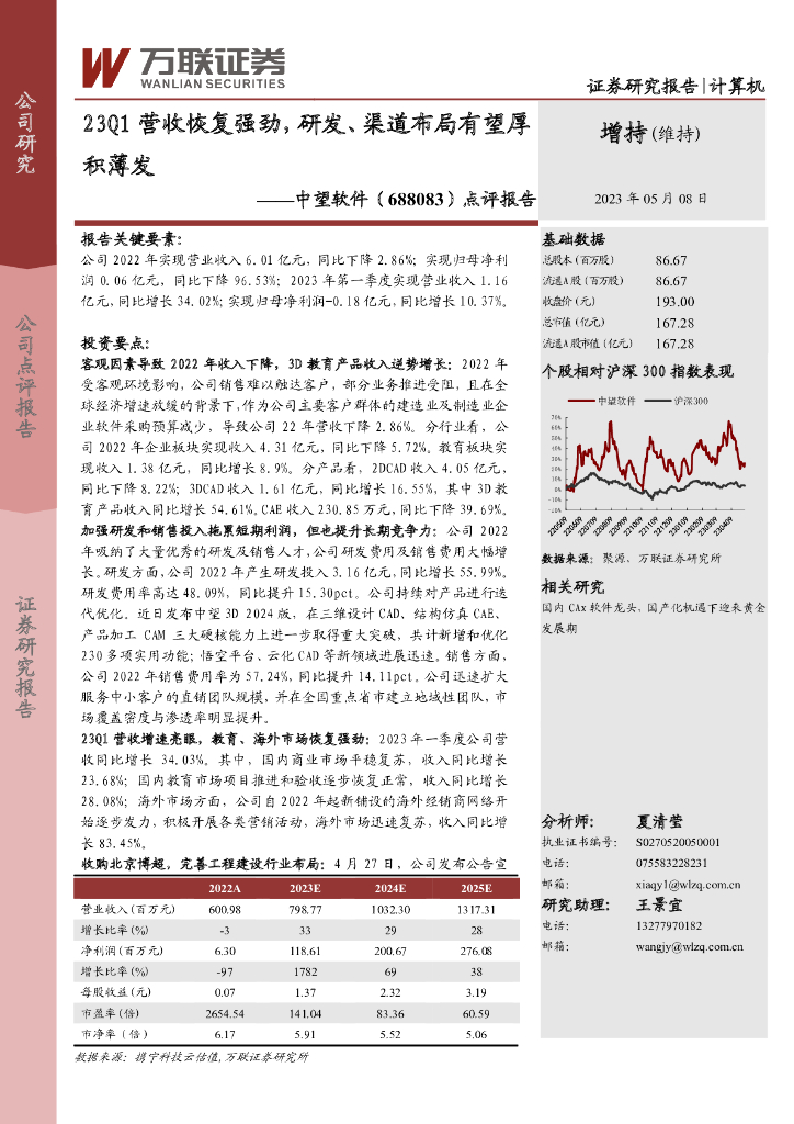 万联证券:中望软件(688083)-点评报告:23Q1营收恢复强劲,研发、渠道布局有望厚积薄发.pdf