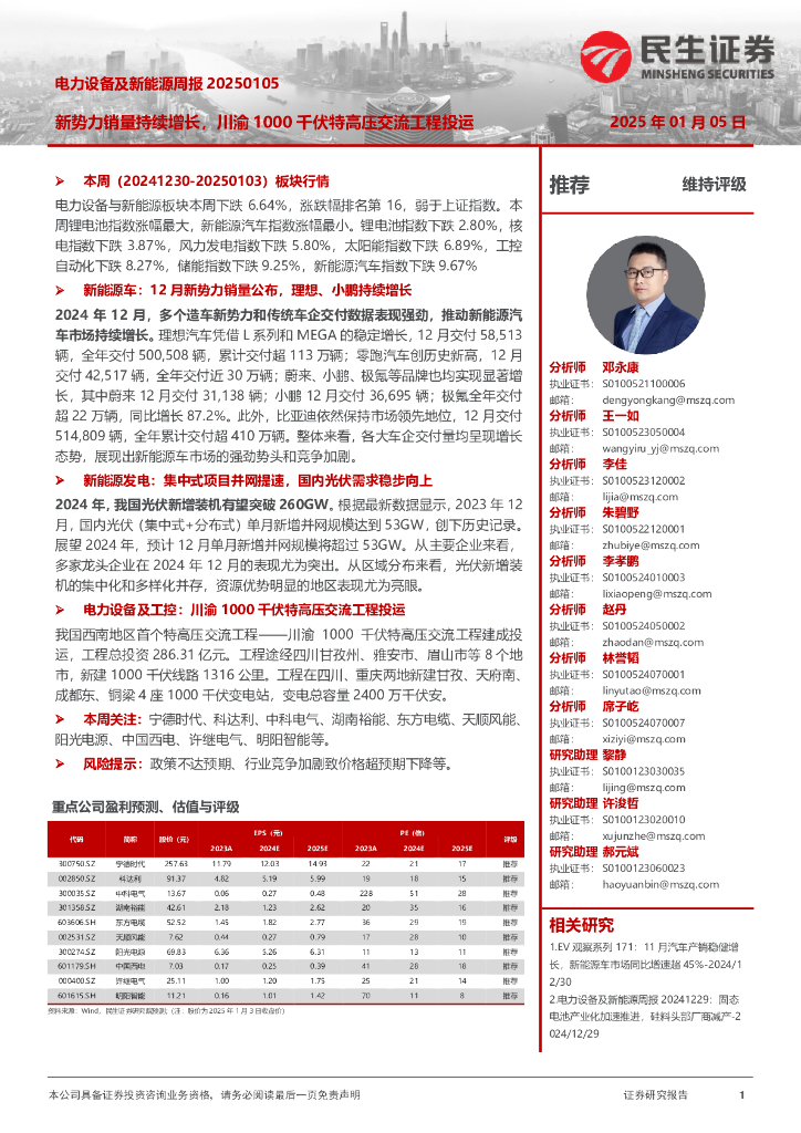 民生证券:电力设备及新能源周报:新势力销量持续增长,川渝1000千伏特高压交流工程投运.pdf