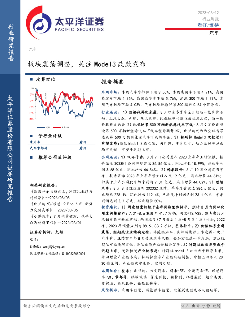 太平洋证券:汽车行业周报:板块震荡调整,关注Model3改款发布.pdf