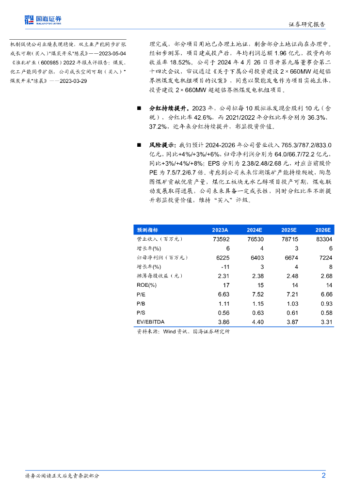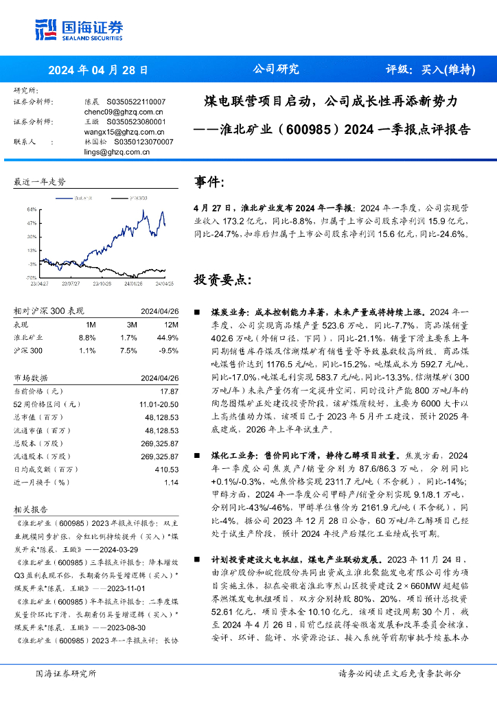 国海证券:淮北矿业(600985)-2024一季报点评报告:煤电联营项目启动,公司成长性再添新势力.pdf