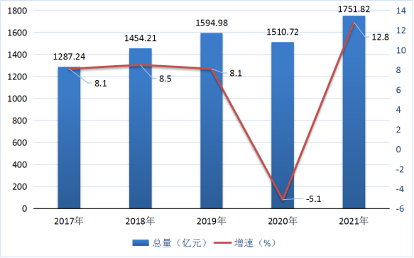 图1 2017-2021年全市生产总值及其增速