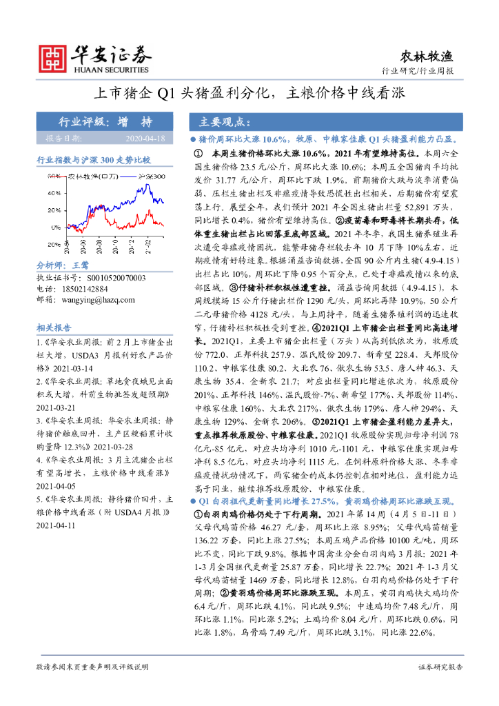 华安证券:农林牧渔行业周报:上市猪企Q1头猪盈利分化,主粮价格中线看涨.pdf