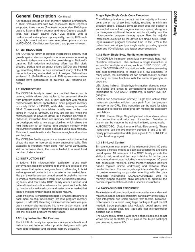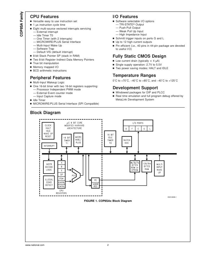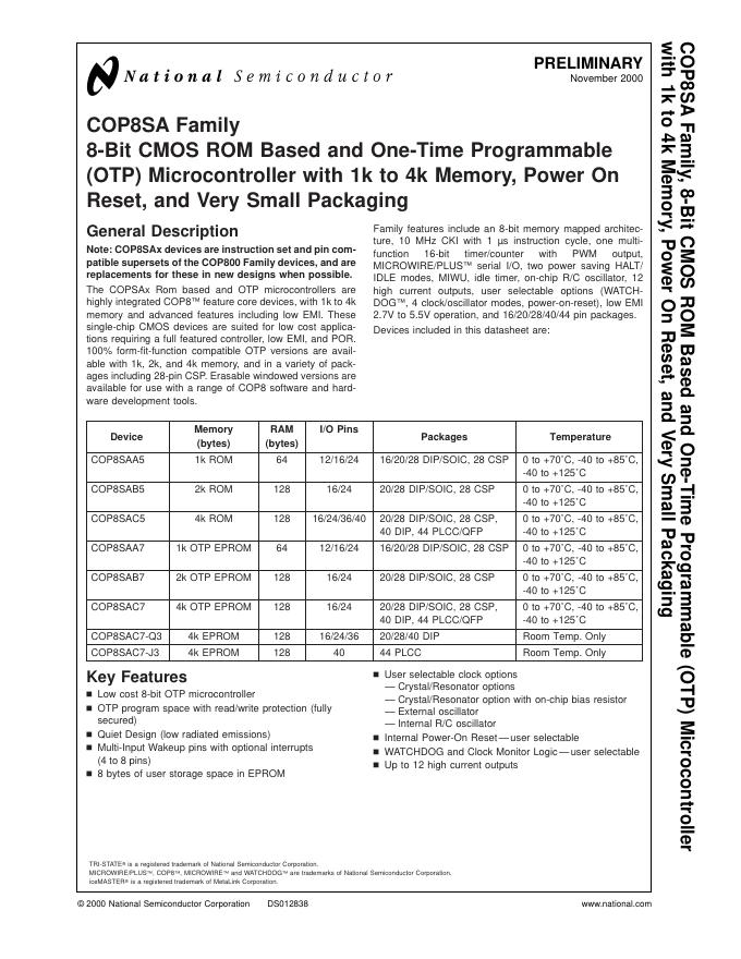 NATIONAL SEMICONDUCTOR COP8SA Family 8-Bit CMOS ROM Based and One-Time Programmable (OTP) Microcontroller with 1k to 4k Memory, Power On Reset, and Very Small Packaging 数据手册.pdf