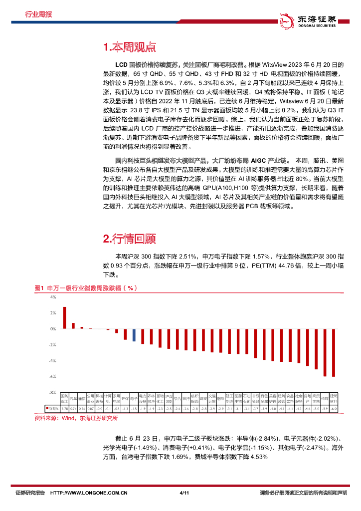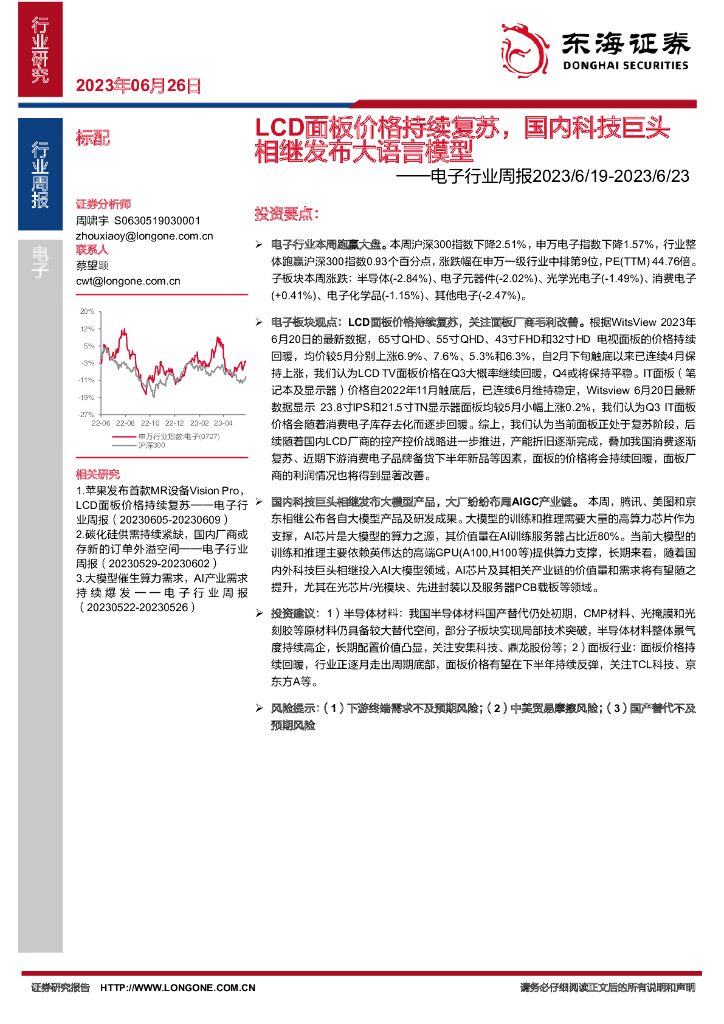 东海证券:电子行业周报:LCD面板价格持续复苏,国内科技巨头相继发布大语言模型.pdf