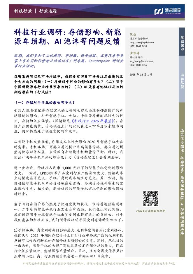 浦银国际证券:科技行业调研:存储影响、新能源车预期、AI泡沫等问题反馈.pdf