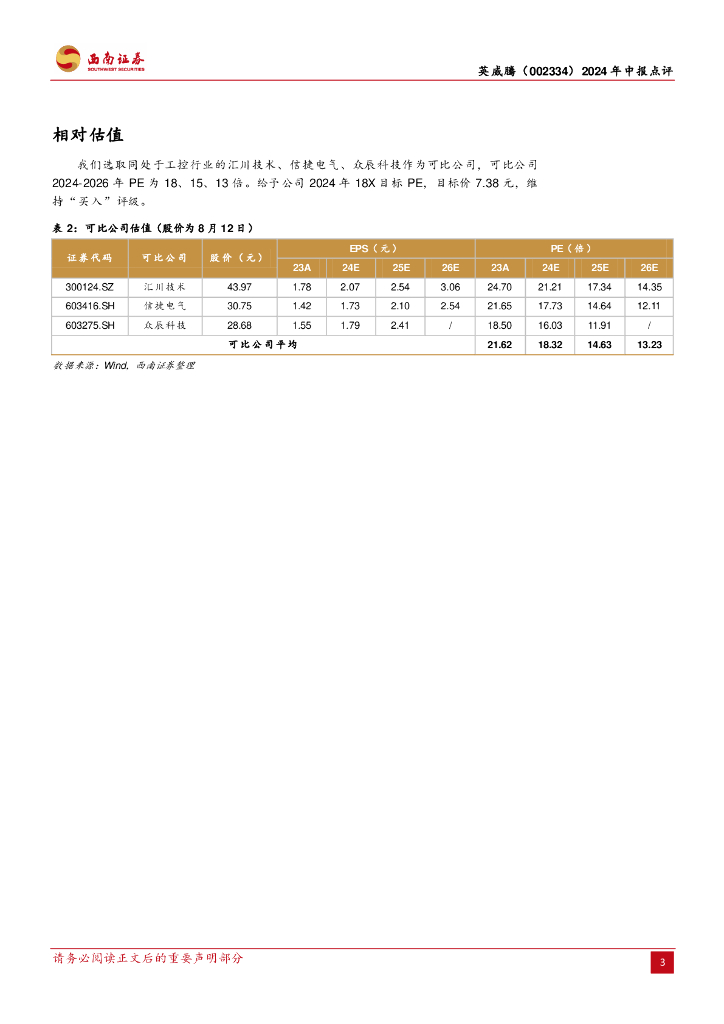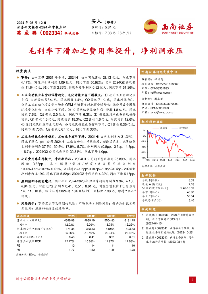 西南证券:英威腾(002334)-2024年中报点评:毛利率下滑加之费用率提升,净利润承压.pdf