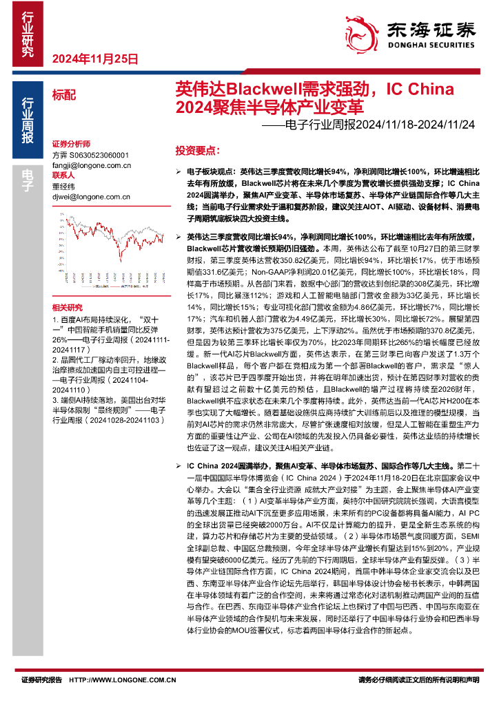 东海证券:电子行业周报:英伟达Blackwell需求强劲,ICChina2024聚焦半导体产业变革.pdf