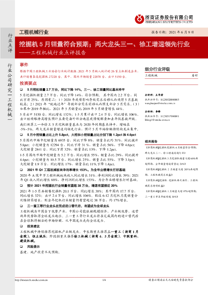 浙商证券:工程机械行业点评报告:挖掘机5月销量符合预期;两大龙头三一、徐工增速领先行业.pdf
