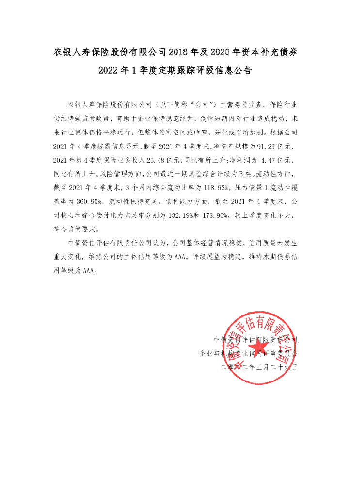 中债资信:农银人寿保险股份有限公司2018年及2020年资本补充债券2022年1季度定期跟踪评级信息公告.pdf