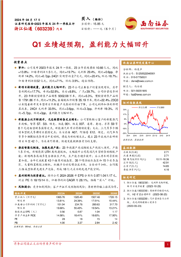 西南证券:浙江仙通(603239)-Q1业绩超预期,盈利能力大幅回升.pdf