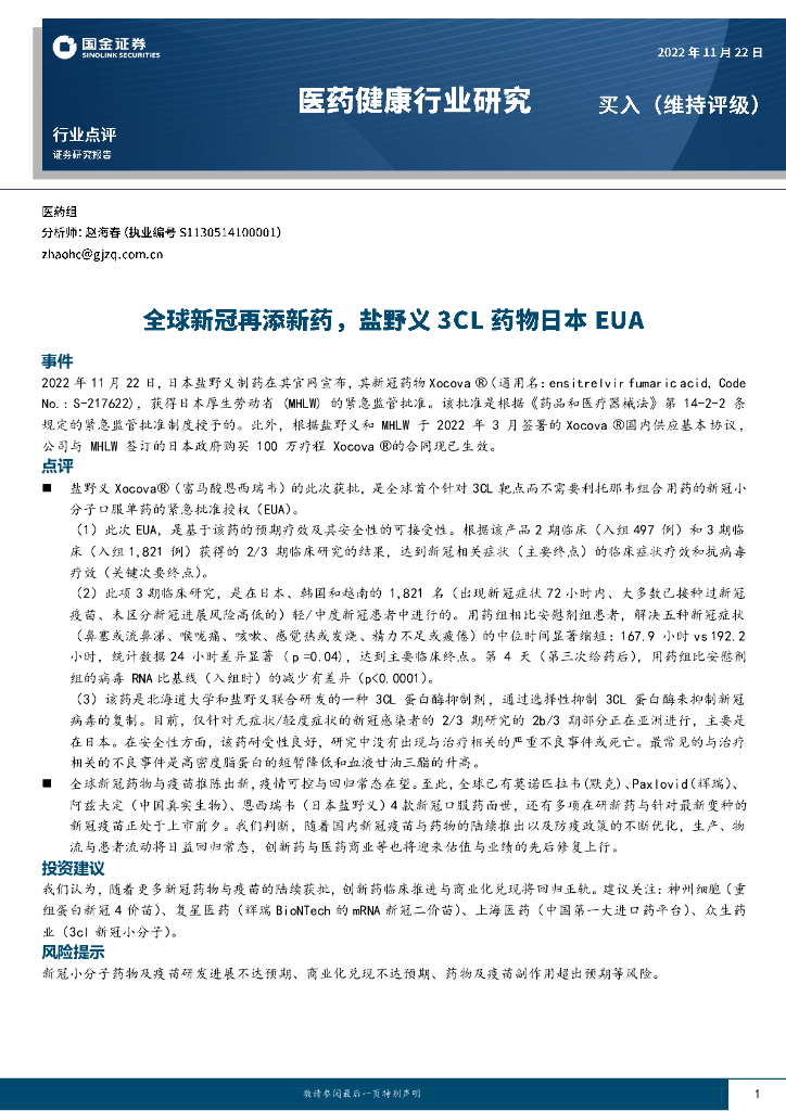 国金证券:医药健康行业研究:全球新冠再添新药,盐野义3CL药物日本EUA.pdf