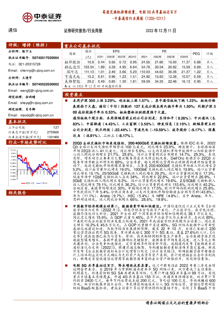 中泰证券:中泰通信行业周报:高速交换机持续放量,电联5G共享基站近百万.pdf