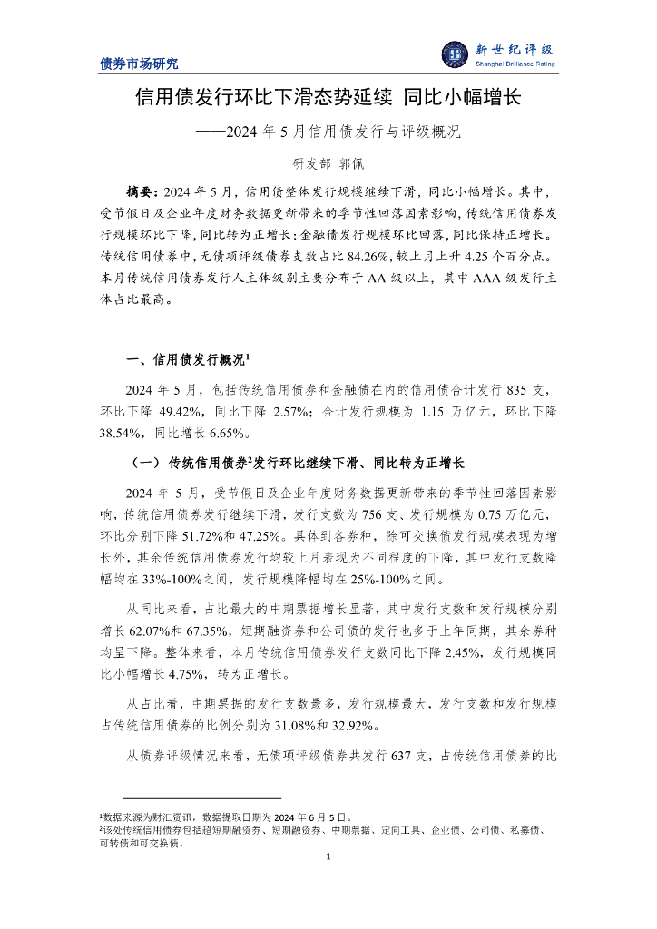 新世纪评级:信用债发行环比下滑态势延续 同比小幅增长——2024年5月信用债发行与评级概况.pdf