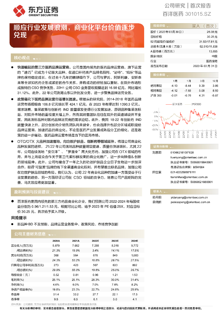 东方证券:百洋医药(301015)-顺应行业发展浪潮,商业化平台价值逐步兑现.pdf
