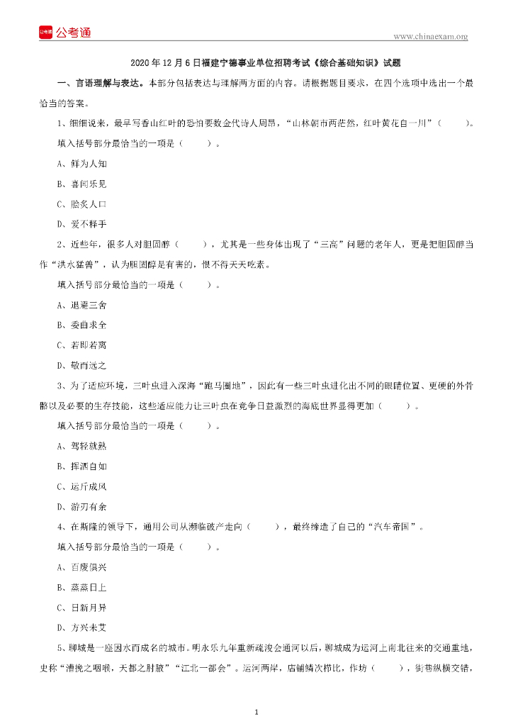 2020年12月6日福建宁德事业单位招聘考试《综合基础知识》试题.pdf