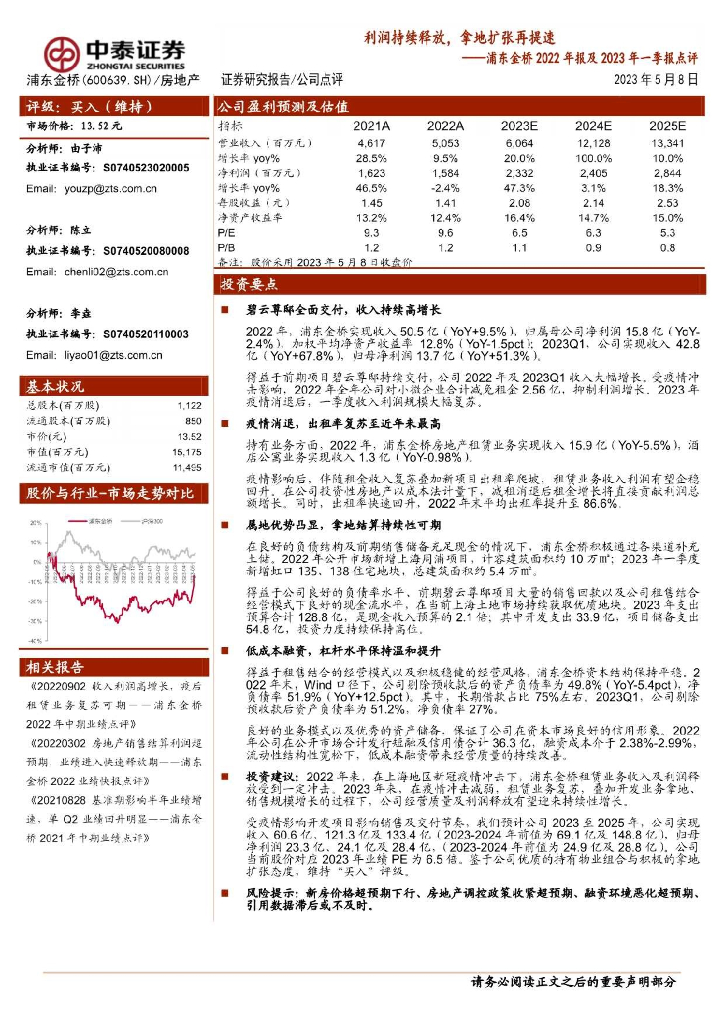 中泰证券:浦东金桥2022年报及2023年一季报点评:利润持续释放,拿地扩张再提速.pdf