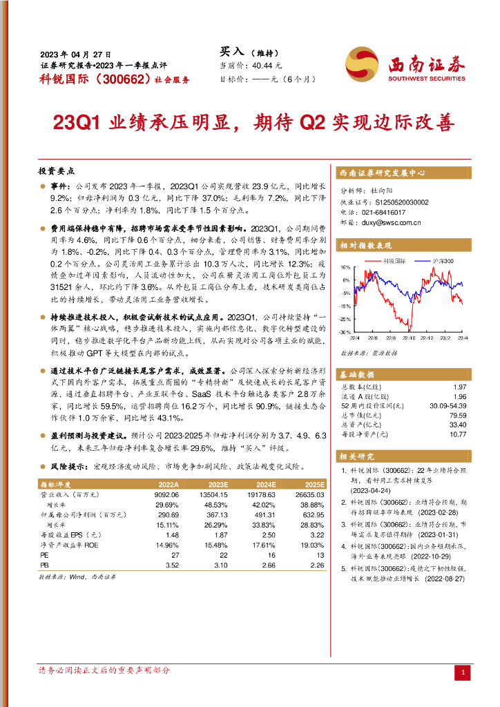 西南证券:科锐国际(300662)-23Q1业绩承压明显,期待Q2实现边际改善.pdf