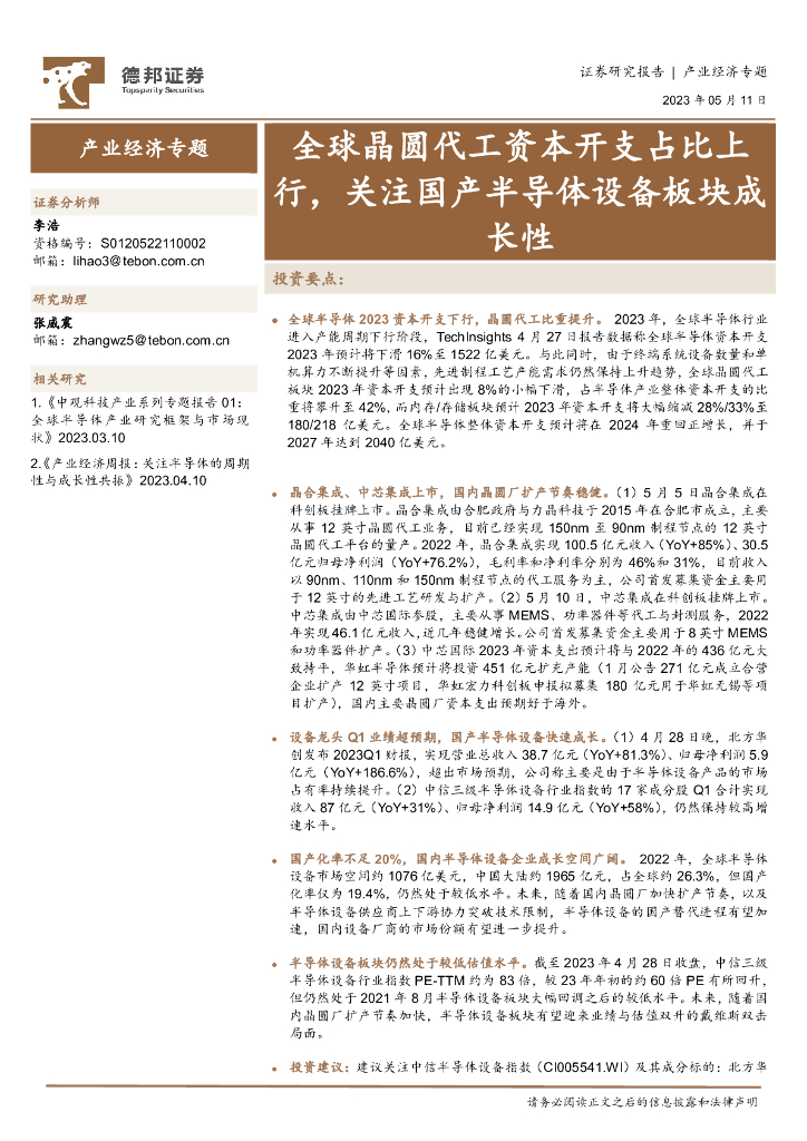 德邦证券:产业经济专题:全球晶圆代工资本开支占比上行,关注国产半导体设备板块成长性.pdf