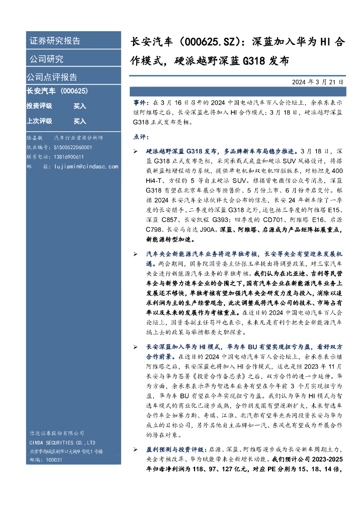 信达证券:长安汽车(000625)-深蓝加入华为HI合作模式,硬派越野深蓝G318发布.pdf