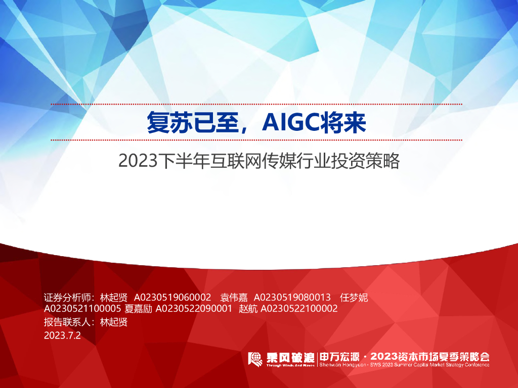 申万宏源:2023下半年互联网传媒行业投资策略:复苏已至,AIGC将来.pdf