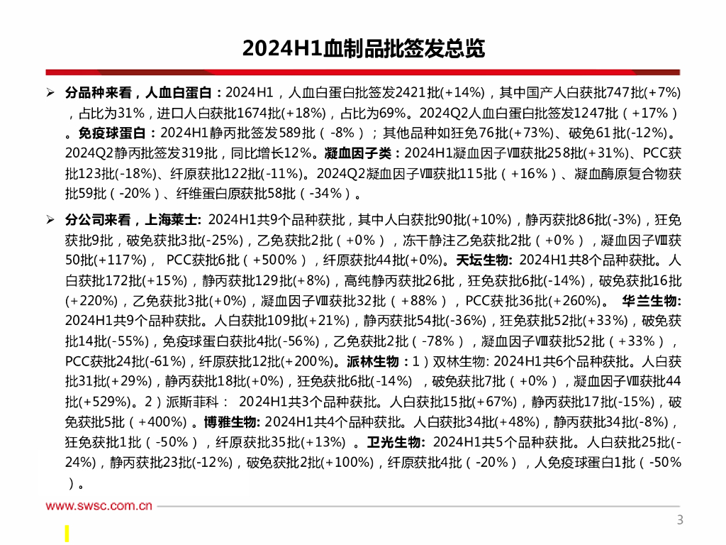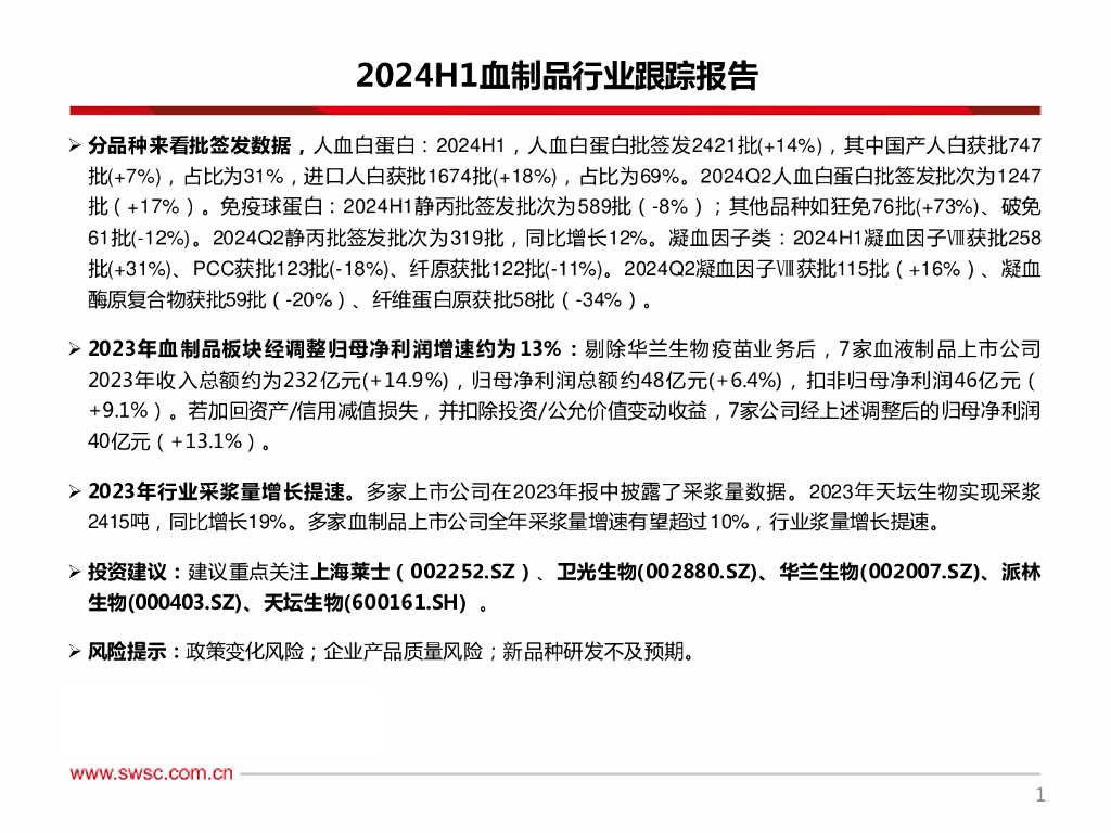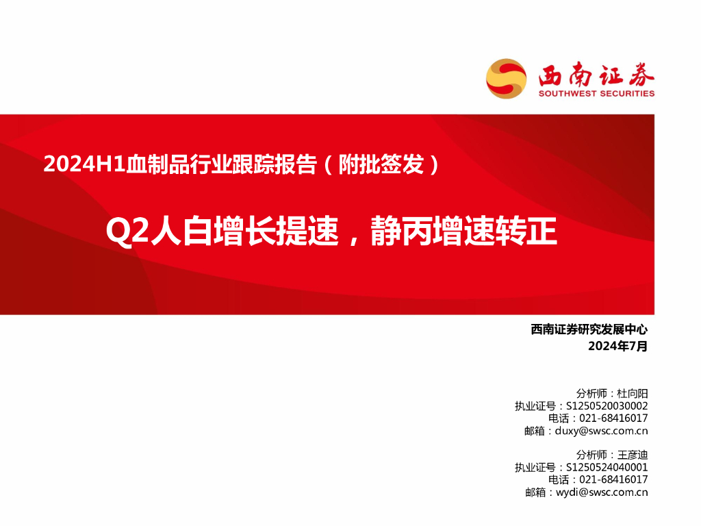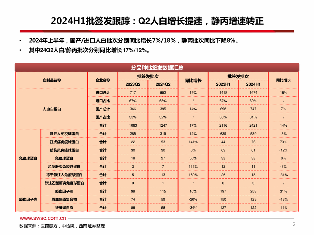 西南证券:2024H1血制品行业跟踪报告(附批签发):Q2人白增长提速,静丙增速转正.pdf