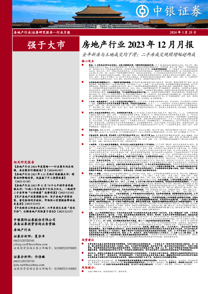 中银证券:房地产行业2023年12月月报:全年新房与土地成交均下滑;二手房成交规模增幅超两成.pdf