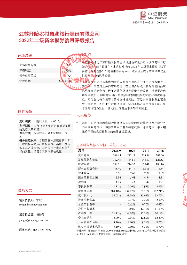 鹏元:江苏盱眙农村商业银行股份有限公司2022年二级资本债券信用评级报告及跟踪评级安排.pdf