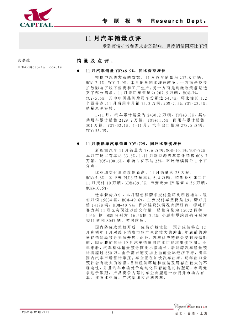 群益证券:11月汽车销量点评:受到疫情扩散和需求走弱影响,月度销量同环比下滑.pdf