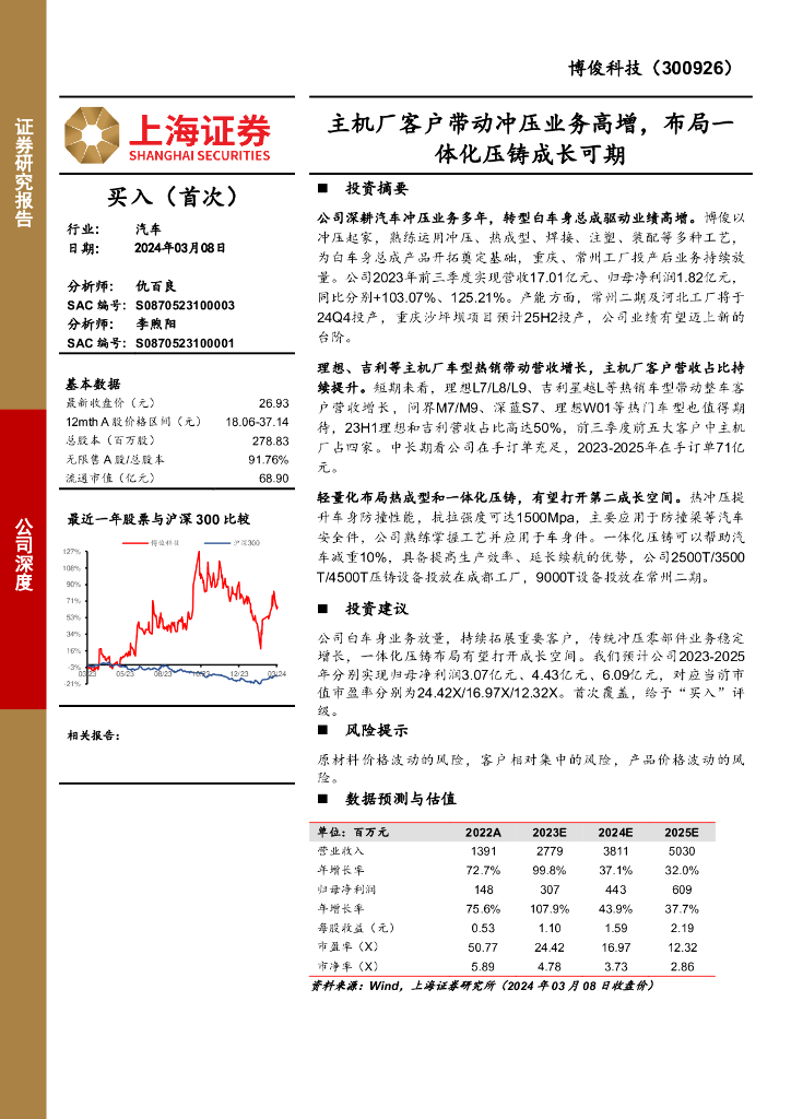 上海证券:博俊科技(300926)-主机厂客户带动冲压业务高增,布局一体化压铸成长可期.pdf