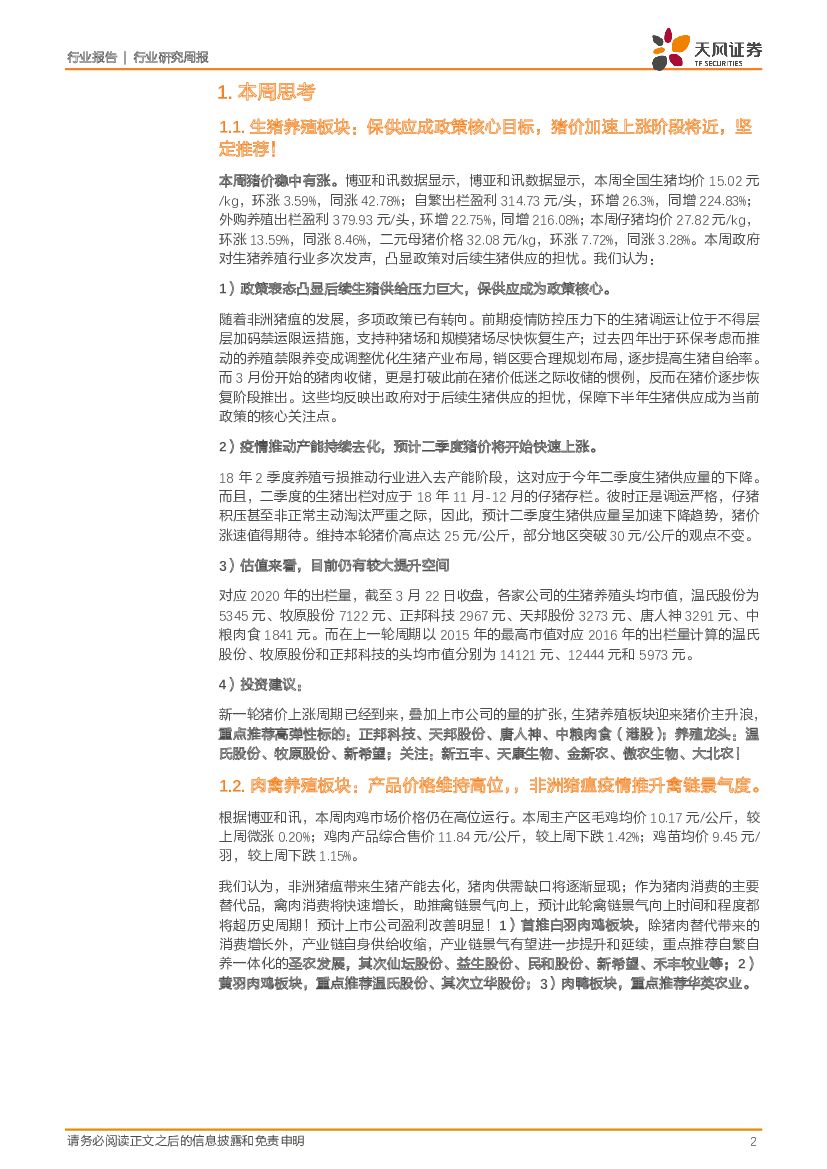 天风证券:农林牧渔2019年第12周周报:保供应成政策核心目标,猪价加速上涨阶段将近,坚定推荐生猪养殖股!.pdf