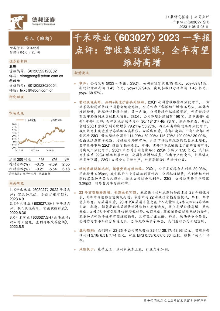 德邦证券:千禾味业(603027)-2023一季报点评:营收表现亮眼,全年有望维持高增.pdf