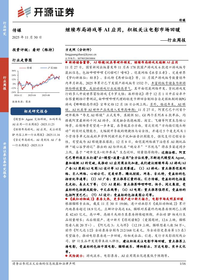 开源证券:传媒行业周报:继续布局游戏等AI应用,积极关注电影市场回暖.pdf