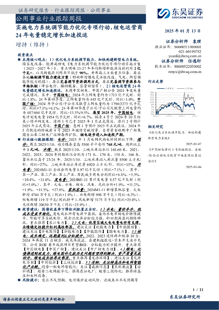 东吴证券:公用事业行业跟踪周报:实施电力系统调节能力优化专项行动,核电运营商24年电量稳定增长加速投运.pdf