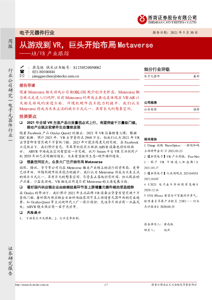 浙商证券:电子元器件行业周报:AR/VR产业跟踪-从游戏到VR,巨头开始布局Metaverse.pdf