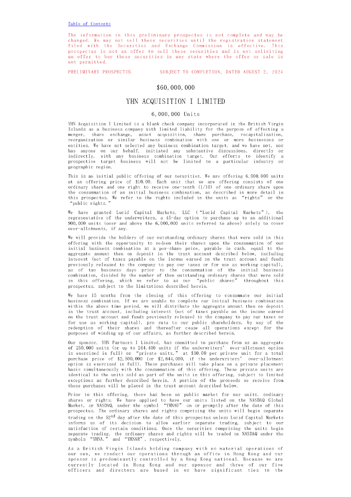 YHN Acquisition I Limited美股纳斯达克IPO上市招股说明书.pdf
