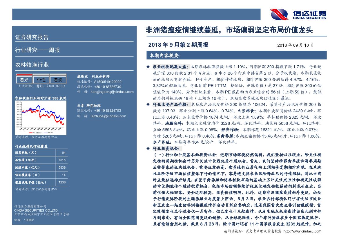 信达证券:农林牧渔2018年9月第2期周报:非洲猪瘟疫情继续蔓延,市场偏弱坚定布局价值龙头.pdf