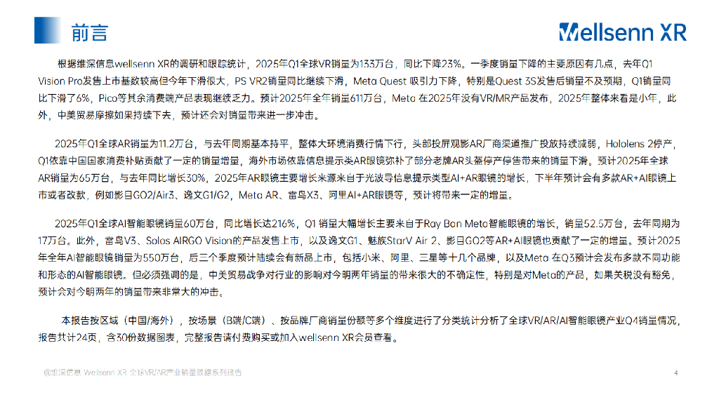 维深Wellsenn XR:2025年第一季度VR/AR/AI眼镜产业销售量跟踪系列报告(摘要版).pdf