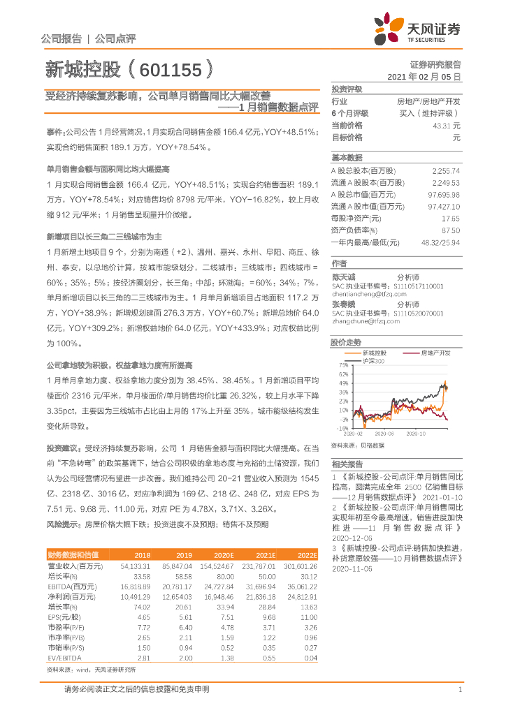 天风证券:新城控股(601155)-1月销售数据点评:受经济持续复苏影响,公司单月销售同比大幅改善.pdf