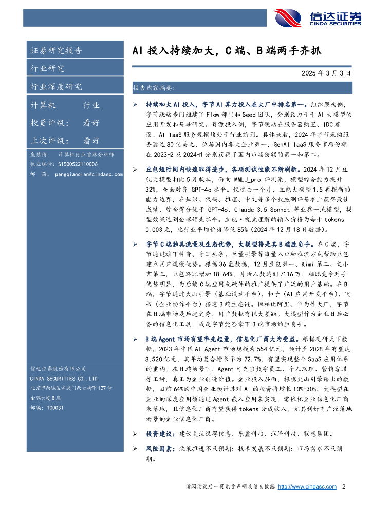 信达证券:计算机行业:豆包大模型行业深度报告:AI投入持续加大,C端、B端两手齐抓.pdf