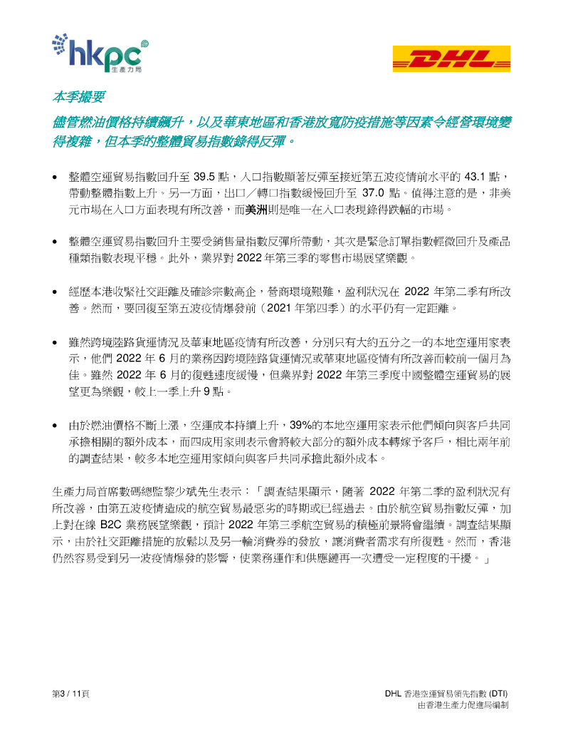 香港生产力促进局:2022年第三季度DHL香港空运贸易领先指数(DTI)报告(繁体版).pdf
