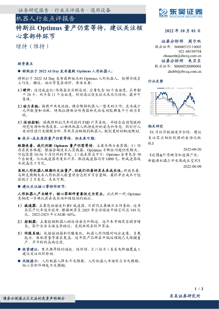 东吴证券:机器人行业点评报告:特斯拉Optimus量产仍需等待,建议关注核心零部件环节.pdf