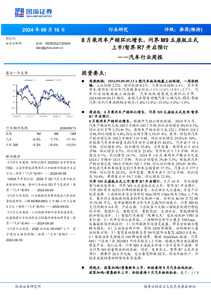 国海证券:汽车行业周报:8月乘用车产销环比增长,问界M9五座版正式上市/智界R7开启预订.pdf