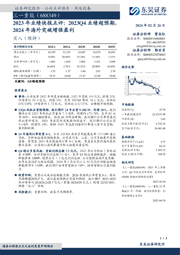 东吴证券:三一重能(688349)-2023年业绩快报点评:2023Q4业绩超预期,2024年海外突破增强盈利.pdf