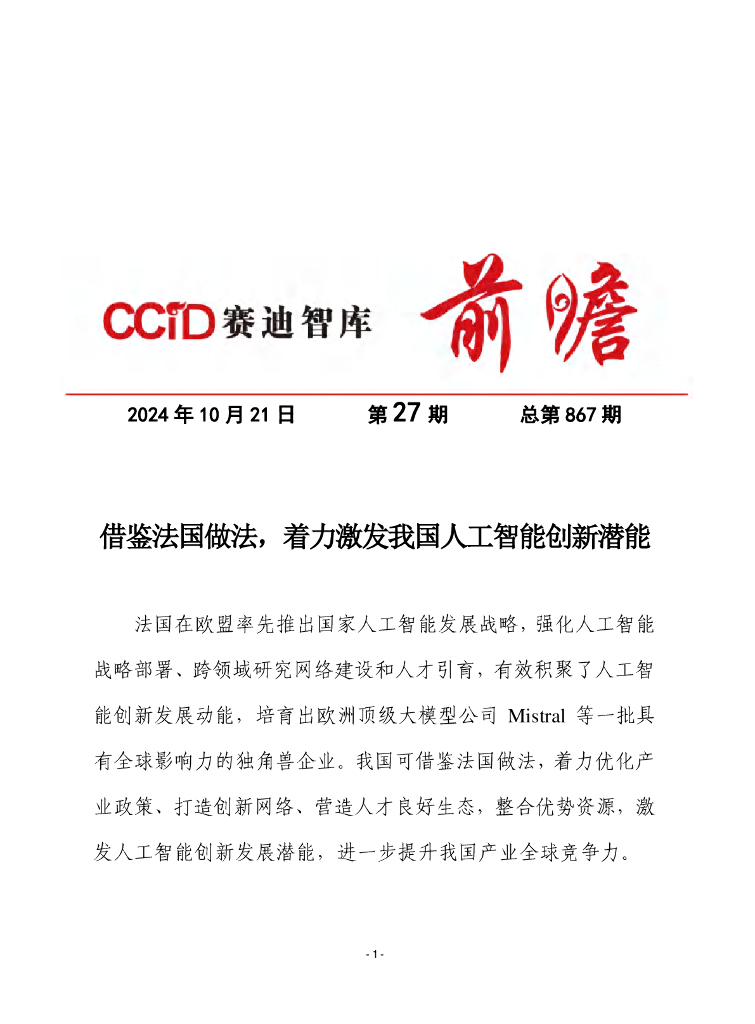赛迪前瞻:2024年第27期(总867期):借鉴法国做法,着力激发我国人工智能创新潜能.pdf