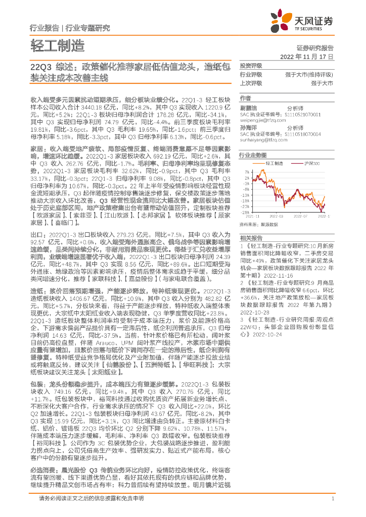 天风证券:轻工制造22Q3综述:政策催化推荐家居低估值龙头,造纸包装关注成本改善主线.pdf