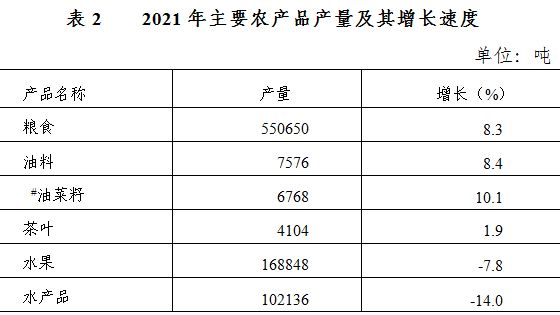 全年粮食总产量55.06万吨,比上年增长8.3%。预计,油料总产量7576吨,比上年增长8.4%,其中油菜籽6768吨,比上年增长10.1%;茶叶总产量4104吨,比上年增长1.9%;水果总产量16.88万吨,比上年下降7.8%。