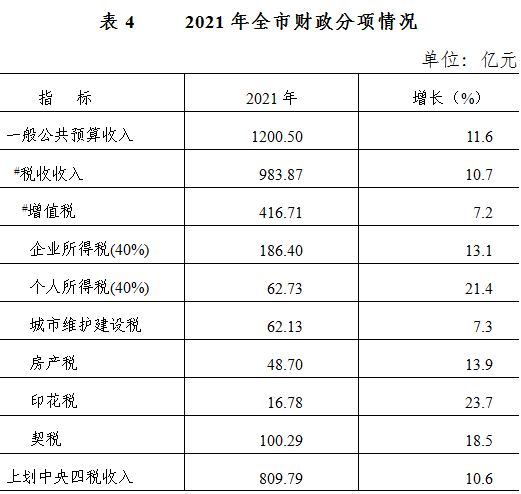 财政收入稳步提高,全市一般公共预算收入达到1200.50亿元,比上年增长11.6%。财政支出力度进一步加大,一般公共预算支出1357.91亿元,比上年增长11.8%。